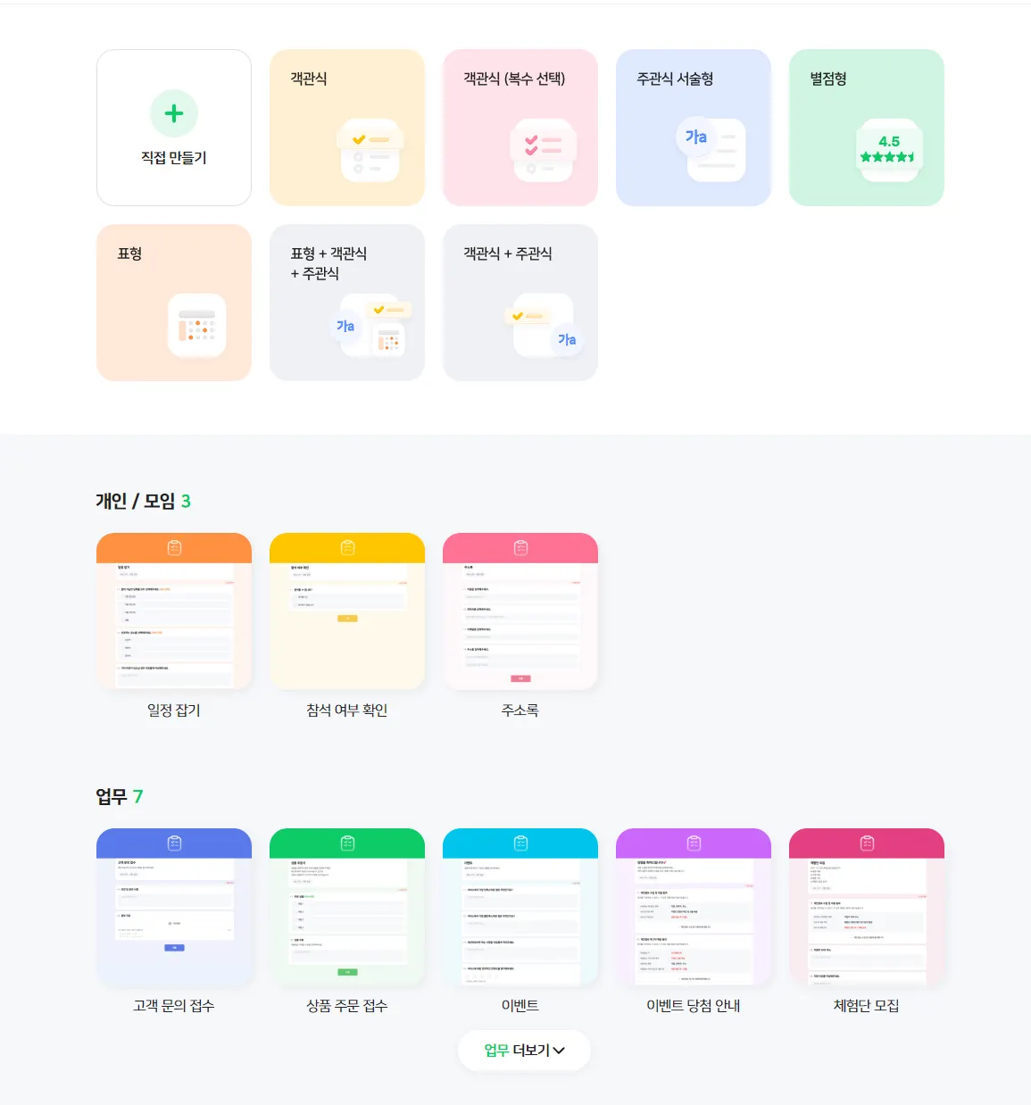 첫화면에 '개인/모임' // '업무' 이런 식으로 카테고리를 딱 분류해서 적절한 템플릿을 선택할 수 있게 해주고 있습니다.