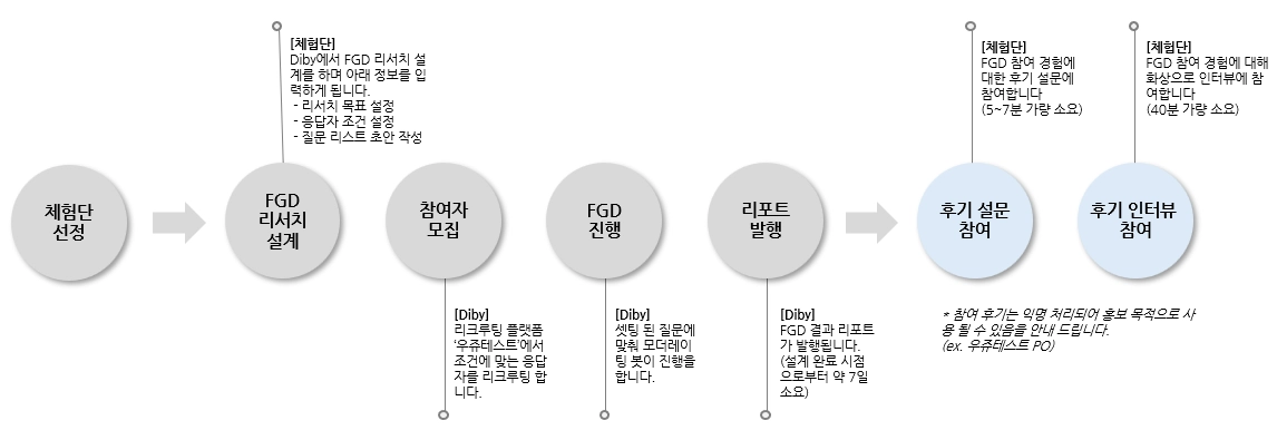 체험단에 선정되면 Diby의 채팅형 FGD의 전체 프로세스를 무료로 진행해 보실 수 있어요